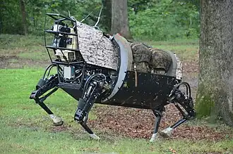 BigDog was a quadrupedal robot created in 2005 by Boston Dynamics, in conjunction with Foster-Miller, the Jet Propulsion Laboratory, and the Harvard University Concord Field Station. It was funded by DARPA in the hopes that it would be able to serve as a robotic pack mule to accompany soldiers in terrain too rough for vehicles, but the project was shelved after BigDog was deemed too loud to be used in combat.[19][20] Instead of wheels, BigDog used four legs for movement, allowing it to move across surfaces that would defeat wheels. Called "the world's most ambitious legged robot", it was designed to carry 340 pounds (150 kg) alongside a soldier at 4 miles per hour (6.4 km/h; 1.8 m/s), traversing rough terrain at inclines up to 35 degrees.