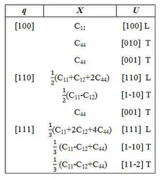 Relationships between elastic constants and X for cubic systems depending upon the direction of propagation of the phonon, q, and the eigenvector of the phonon, U, where L = longitudinal and T = transverse acoustic waves.[6]