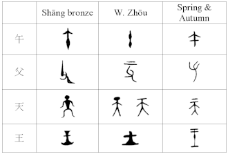 Some flexibility in orientation of graphs (rotation and reversibility) continues in the Western Zhou, but this becomes increasingly scarce throughout the Zhou dynasty.[13] The graphs start to become slightly more uniform in structure, size and arrangement by the time of the third Zhou sovereign, King Kāng, and after the ninth, King Yì, this trend becomes more obvious.[14]