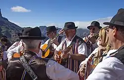 Modern-day Canarian culture is Spanish, with some Guanche influences. Some of the Canarian traditional sports such as lucha canaria ("Canarian fight"), juego del palo ("stick game") or salto del pastor ("shepherd's jump"), among others, have their roots in Guanche culture. Additionally, other traditions include Canarian pottery, words of Guanche origin in the Canarian speech and the rural consumption of guarapo gomero and gofio. The inhabitants of La Gomera also retain an ancient way of communicating across deep ravines by means of a whistled speech called Silbo Gomero, which can be heard up to 3 km (2 miles) away.[32] This indigenous whistled language was invented by the Guanches, and was then adopted by the Spanish settlers in the 16th century after the Guanches were culturally assimilated into the population. The language was also formerly spoken on El Hierro, Tenerife and Gran Canaria.[33][32]