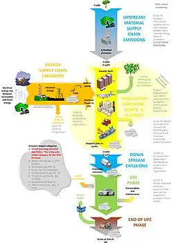 Scope 2 emissions are the indirect emissions related to purchasing electricity, heat, or steam used on site.[20] Examples of upstream carbon emissions include transportation of materials and fuels, any energy used outside of the production facility, and waste produced outside the production facility.[21] Examples of downstream carbon emissions include any end-of-life process or treatments, product and waste transportation, and emissions associated with selling the product.[22] The GHG Protocol says it is important to calculate upstream and downstream emissions. There could be some double counting. This is because upstream emissions of one person's consumption patterns could be someone else's downstream emissions