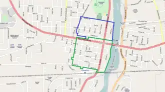 Location of the Central Geneva Historic District (green outline) within Geneva. The adjacent North Geneva Historic District is outlined in blue to the north.