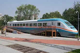 On 21 September 2001, the DJF1, now named the "Zhongyuan Star" was rolled out in a ribbon cutting ceremony, along with the China Railway DJ2 "Olympic Star" electric locomotive at Zhuzhou Electric Locomotive, with the deputy minister for railways, Cai Qinghua, Hunan Province deputy governor Zheng Maoqing and the manager and deputy manager of Zhengzhou bureau, Feng Lingyun and Xu Yifa in attendance.[6] After being rolled out, the DJF1 was transported to the China Academy of Railway Beijing ring railway for operational and safety tests, which it passed successfully. On 19 October 2001, it departed Beijing for Zhengzhou. Under the guidance of the ministry, Zhuzhou Electric Locomotive and Zhengzhou bureau, the DJF1 began publicly testing on the Jingguang railway from 23 October between ZhengzhouXuchangXiaoshangqiaoWuchang; However, problems relating to control logic appeared not long after entering the line for testing.[7] After a period of diagnosis, the problem was solved on the morning of the 24th. The public tests were completed on 26 October, during which it had travelled a total of 2,815 km (1,749 mi), reaching a maximum speed of 178 km/h (111 mph).[8] To fulfill the maintenance demands of the set, a 560 metre long ditch was exclusively built for the use of the DJF1 at Zhengzhou bureau, Zhengzhou sector.
