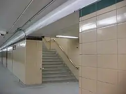 The station was damaged in 1976 when a fire was set on board a late-evening train. Nobody was hurt, but four cars of the train were destroyed and part of the station's platform area, including the tiled wall, suffered severe damage. During the repair parts of the trim were replaced with a different colour; red-brown instead of the original green tile.[2]
