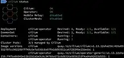 ![]() Command-line session showing the status of a Cilium installation in a Kind cluster | |