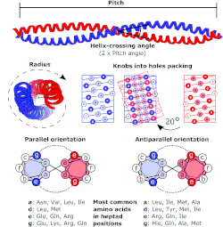 Secondary and tertiary structure of the coiled-coil motif. The heptad repeat often consists of specific amino acids, seen in the figure. Knobs into holes packing is also shown.[28]