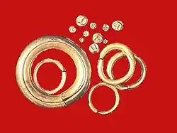The earliest coins are mostly associated with Iron Age Anatolia of the late 7th century BC, and especially with the kingdom of Lydia.[14] Early electrum coins (an alluvial alloy of gold and silver, varying wildly in proportion, and usually about 40–55% gold) were not standardized in weight, and in their earliest stage may have been ritual objects, such as badges or medals, issued by priests.[15] The unpredictability of the composition of naturally occurring electrum implied that it had a variable value, which greatly hampered its development.[16]