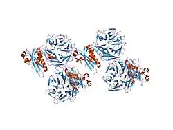 A colicin is a type of bacteriocin produced by and toxic to some strains of Escherichia coli.[1] Colicins are released into the environment to reduce competition from other bacterial strains. Colicins bind to outer membrane receptors, using them to translocate to the cytoplasm or cytoplasmic membrane, where they exert their cytotoxic effect, including depolarisation of the cytoplasmic membrane, DNase activity, RNase activity, or inhibition of murein synthesis.