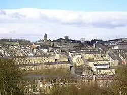 Colne was once a township in the ancient parish of Whalley which became a civil parish in 1866.[13] A local board was formed in 1875, the district including part of Great Marsden, on the south side of Colne Water between Fox Clough and Swinden Clough.[14][10] This area was made an urban district in 1894 and designated a Municipal Borough in 1895. In 1935 the borough absorbed an area to the east around Barnside, historically a detached part of Foulridge.[15]