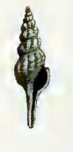 (Original description) The shell is of small to medium size, somewhat narrow elongate fusiform. The aperture and the siphonal canal have about the same length as the spire. The spire is acute, made up of a rather small embryonic portion, succeeded by numerous, gradually increasing, convex, and more or less strongly costated whorls. The apical angle is about twenty-five to thirty degrees. The protoconch is rather small, consisting of about 1+12 smooth convex whorls. The spire consistis of seven or eight regularly convex whorls, with their greatest convexity about the middle of each whorl, and with a well-impressed suture.. The aperture is oval. The outer lip is rather thin and smooth internally, with a well-defined broad but comparatively shallow sinus just below the suture. From the sinus the lip projects slightly forward with a regular convex arch, then curving downwards to join the anterior canal. The sinuses about one to one-and-a-half millimetre broad, but usually only about half this measurement in depth. At the anterior end the aperture opens into a long, straight, slender and open siphonal canal, which is much longer than the aperture. The inner lip shows a thin enamel coating. The columella is simple and smooth, straight, slender, and gently tapering to the anterior end. The surface is ornamented with oblique ribs, which are most highly elevated about the middle of each whorl, and fade off more rapidly towards the posterior suture than the anterior. The ribs number usually nine to a whorl, an occasional example shows as many as eleven or twelve on the body whorl. The strength of development of the ribs is somewhat variable, especially on the anterior whorls, where they are occasionally only just visible. The ribs are traversed by comparatively coarse and fine spiral threads. Of these there are four to six coarser and more prominent than the rest, situated in the anterior two-thirds of each whorl, especially prominent where they cross the ribs, more numerous, amounting to about eight or nine, on the body whorl, with much broader interspaces between each of which has a medial finer thread with a pair of still tinier threads on either side of it. The posterior third is occupied by from about ten to fifteen very fine spiral threadlets, also the fine lines of growth of the sinus are in this space. Both ribs and spiral threads are traversed by the fine oblique forwardly directed lines of growth.[2]
