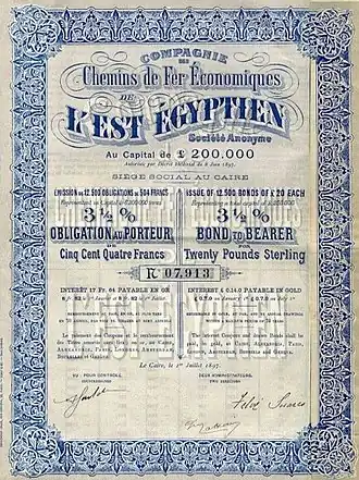 The railway company issued 12,500 stock exchange certificates at 3.5% of the total capital, i.e. 20 GBP (504 F) each, to be paid back within 70 years. The Paribas bank purchased shares at the value of 446.25 F and re-sold them at the same price to the public withholding a 4% premium. From a political point of view, this was one of the best concessions of Lower-Egypt and increased the French influence onto the region. The guaranteed annual net income of 315,000 F for the 350 km of railway track, promised to provide a profitable margin in comparison to the 242,304 F investment.[1] § 52 The results exceeded the most optimistic prognoses of the founders, which led to an increase of capital to 8,125,000 F in March 1900. The new 100 F shares were issued at 106,25 F, to gain 3,320,300 F. A quarter of the first and second tranche of the shares and all loans were sold in France at a total of 7,674,141 F.[1] § 53