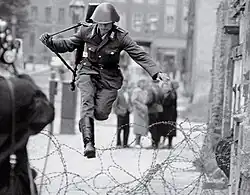 Schumann leaping over barbed wire into West Berlin on 15 August 1961.