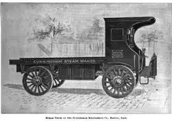 The Cunningham Steam Wagon was a product of the Massachusetts Steam Wagon Company of Pittsfield, Massachusetts, in the United States. The firm was established in December 1900, with the intention of manufacturing the products that the Cunningham Engineering Company of Boston, Massachusetts, planned to develop. Instead, they built a small steam powered truck with four wheel drive. Production ceased at the end of 1901.