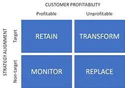 This 4-boxes (matrix of customer profitability and strategy alignment) method was suggested by several literature positions.[2][3]