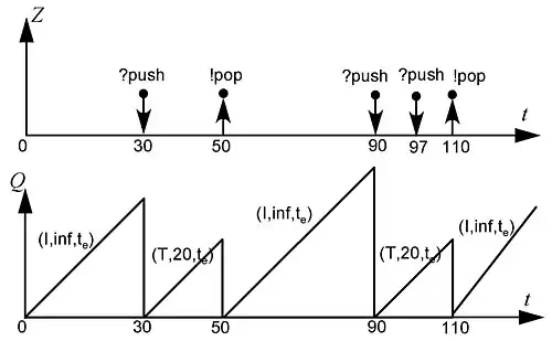 One interesting feature of SF-DEVS might be the preservation of schedule the restriction (3) of SP-DEVS which is drawn at time 47 in Fig. 3. when the external event ?p happens. At this moment, even though the state can change from G to GR, the elapsed time does not change so the line segment is not broken at time 47 and can grow up to which is 30 in this example. Due to this preservation of the schedule from input events as well as the restriction of the time advance to the non-negative rational number (see restriction (2) above), the height of every saw can be a non-negative rational number or infinity (as shown in the bottom of Fig. 3.) in a SP-DEVS model.