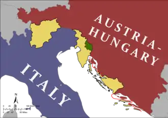 Dalmatia was a strategic region during World War I that both Italy and Serbia intended to seize from Austria-Hungary. Italy joined the Triple Entente Allies in 1915 upon agreeing to the Treaty of London that guaranteed Italy the right to annex a large portion of Dalmatia in exchange for Italy's participation on the Allied side. From 5–6 November 1918, Italian forces were reported to have reached Vis, Lastovo, Šibenik, and other localities on the Dalmatian coast.[64] By the end of hostilities in November 1918, the Italian military had seized control of the entire portion of Dalmatia that had been guaranteed to Italy by the Treaty of London and by 17 November had seized Rijeka as well creating the first Governorate of Dalmatia.[65] In 1918, Admiral Enrico Millo declared himself Italy's Governor of Dalmatia.[65] Famous Italian nationalist Gabriele D'Annunzio supported the seizure of Dalmatia, and proceeded to Zadar in an Italian warship in December 1918.[66] However, in spite of the guarantees of the Treaty of London to Italy of a large portion of Dalmatia and Italian military occupation of claimed territories of Dalmatia, during the peace settlement negotiations of 1919 to 1920, the Fourteen Points of Woodrow Wilson that advocated self-determination of nations took precedence, with Italy only being permitted to annex Zadar from Dalmatia, while the rest of Dalmatia was to be part of Yugoslavia.