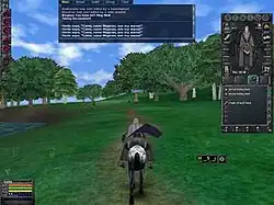 The player character riding a horse through the realm of Hibernia. The early 2001-era graphic engine and HUD design can be seen in this shot.