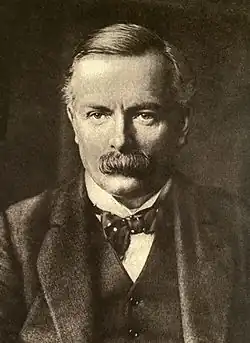 Historian Emyr Price referred to Lloyd George as "the first architect of Welsh devolution and its most famous advocate" as well as "the pioneering advocate of a powerful parliament for the Welsh people".[22] Lloyd George himself stated in 1890, "the Imperial Parliament is so overweighted with the concerns of a large empire that it cannot possibly devote the time and trouble necessary to legislate for the peculiar and domestic requirements of each and every separate province".[23] These statements would later be used to advocate for a Welsh assembly in the 1979 Welsh devolution referendum.[24] Lloyd George felt that disestablishment, land reform and other forms of Welsh devolution could only be achieved if Wales formed its own government within a federal imperial system.[17] In 1895, in a failed Church in Wales Bill, Lloyd George added an amendment in a discreet attempt at forming a sort of Welsh home rule, a national council for appointment of the Welsh Church commissioners. Although not condemned by Tom Ellis MP, this was to the annoyance of J. Bryn Roberts MP and the Home Secretary H. H. Asquith MP.[25][26][27]