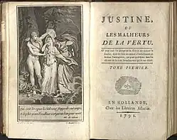 Contemporary critics were generally hostile to Sade's works. When his play Oxtiern premiered in 1791, the critic for the Moniteur stated, "there is interest and energy in the play, but the role of Oxtiern is a revolting atrocity".[133] The anonymous Justine and Juliette were seen as obscene works. A review of Justine in the Journal Général de France stated that although Sade displayed "a rich and brilliant" imagination, "It is difficult to not often close the book out of disgust and indignation".[134] There were rumours that Danton and Robespierre used Justine as an aid to masturbation and to inflame their lust for blood.[135] Rétif de la Bretonne published an Anti-Justine in 1798.[136] By 1800, numerous authors were attributing Justine to Sade. One reviewer called Sade's Crimes of Love "a detestable book written by a man suspected of having written a yet more horrible one".[137]