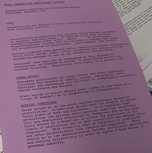 Page 1/2 of an original copy of the World Charter for Prostitutes' Rights (1985)