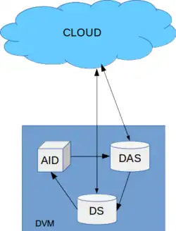 To establish a cloud-dew architecture on a PC, a dew virtual machine (DVM) is needed. The DVM is an isolated environment for executing the dew server on the local PC, and it consists of at least three components: the dew server (DS), the data analytics server (DAS), and the artificial intelligence of the dew (AID).[6]