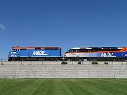 The EMD F40PH (left) and MPI MPXpress-series MP36PH-3S (right) locomotives coupled together by Metra use diesel–electric transmission.