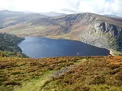 Djouce (Irish: Dioghais, meaning 'fortified height')[2] at 725 metres (2,379 ft), is the 74th–highest peak in Ireland on the Arderin scale,[3] and the 91st–highest peak on the Vandeleur-Lynam scale.[4][5] Djouce is situated in the northeastern section of the Wicklow Mountains, and dominates the views of the Wicklow Mountains from Roundwood to Newtownmountkennedy.[2] Djouce is one of a few Irish mountains for which the Irish Office of Public Works (OPW) maintain a boarded mountain trail, using railway sleepers, from its base to a point close to its summit; making the mountain even more accessible to the public, but while also protecting the underlying bog and soil from human erosion.[1][6] Djouce is popular with hill walkers, and it lies along the 131-kilometre Wicklow Way; on its southern slopes at a scenic viewpoint is the J.B. Malone memorial stone, dedicated to the creator of the Wicklow Way.