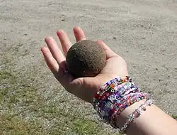More recently, the process has been refined into the art of the hikaru ("shining") dorodango (光る泥だんご), which has a glossy surface. Several different techniques can be used.[1][2] Across all methods, a core of the ball is made of basic mud, which has been carefully shaped by hand to be as round as possible. This core is left to dry, and then methodically and carefully dusted with finely sifted soil to create a crust several millimeters thick around the core. This step may be repeated several times, with finer and finer grains of dirt in order to create a smooth and shiny surface. A cloth then may be used to gently polish the surface. The dorodango, once completed, may look like a polished stone sphere, but it is still very fragile. The process requires several hours and careful focus so as not to break the ball.