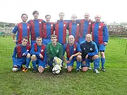 Douglas and District (in yellow) in an Isle of Man FA Cup match against Douglas High School Old Boys F.C. during the 2008–09 season