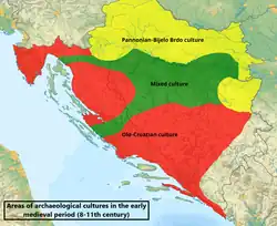 Some of the findings "are a characteristic of Croatian production".[50] Since the mid-9th century flourished a distinctive Croatian-type production of jewellery (most notable being large bead shaped earrings with "no contemporary European parallel", while statistically by order earrings, pendants, rings, buttons, necklaces).[70] The workshops probably were located in Solin and Knin in Dalmatia,[71] and Sisak in the continental part.[72] Archaeologists recognize and distinguish two cultural variants of the "Old-Croatian" archaeological period (7/9th-11th century[73]), a proper Old-Croatian or Croatian-Dalmatian/Littoral culture, and Pannonian-Bijelo Brdo culture (since mid-10th century[74]),[75][76] which were contemporary to Carinthian-Köttlach culture in the west.[77][78] Findings of the Croatian-Dalmatian variant were found from Istria down to Dubrovnik, in the hinterland near rivers Neretva, Vrbas and Bosna and into southwestern Pannonia, while the second variant was mostly present between SavaDrava region in Croatia and in northern Bosnia and Herzegovina with some findings in Adriatic coast and hinterland.[79][80] The archaeological findings of Croatian-Dalmatian culture in Lower Pannonia and northwestern Bosnia and Herzegovina, as well in Istria and eastern parts of Bosnia and Herzegovina, can be attributed to influence and trade, but also expansion of the early medieval Croatia.[81]