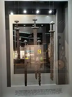 Croats from the late-8th and in the 9th century have high concentration of Carolingian-Viking swords (over 24,[49] mostly of K-type but also 1-type and H-type,[50][51] post-Carolingian emerge R-type and X-type[52][53]), and other war equpiment (including a long knife, long spear, and arrows, as well boots with spurs, belt trappings and else of Carolingian influence),[54] some considered as evidence of Croatian participation in the Frankish-Avar Wars in the late 8th and early 9th century (although Frankish sources do not mention Croatian ethnonym between early 7th and late 9th century[55]), and being part of the Central-European and Carolingian political and cultural world of influence at least since duke Borna (c. 810–821).[56][57] However, the distribution and concentration of K-type swords in Europe does not correspond with the hypothesis they were official armament of the Frankish army.[58] They are neither evidence of a late 8th-early 9th century migration of Croats, as some scholars have argued, but as Frankish gifts of loyalty,[59] were influential to the consolidation of the Croatian elite identity and ethnogenesis at the time.[60][61] The distribution of post-Carolingian weapons and cavalry equipment in present-day Croatia and Bosnia and Herzegovina, found near old roads and often with gold coins of Constantine V (741–775) which were still in use,[62] is within the borders and correspoding historical events related to the Duchy of Croatia and Kingdom of Croatia.[63]