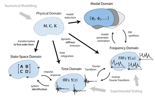 The physical domain concerns methods that are based on (linearised) mass, damping and stiffness matrices, typically obtained from numerical FEM modelling. Popular solutions to solve the associated system of second order differential equations are the time integration schemes of Newmark[8] and the Hilbert-Hughes-Taylor scheme.[9] The modal domain concerns component mode synthesis (CMS) techniques such as the Craig-Bampton, Rubin and McNeal method. These methods provide efficient modal reduction bases and assembly techniques for numerical models in the physical domain. The frequency domain is more popularly known as frequency-based substructuring (FBS). Based on the classic formulation of Jetmundsen et al.[5] and the reformulation of De Klerk et al.,[9] it has become the most commonly used domain for substructuring, because of the ease of expressing the differential equations of a dynamical system (by means of frequency response functions, FRFs) and the convenience of implementing experimentally obtained models. The time domain refers to the recently proposed concept of impulse-based substructuring (IBS),[10] which expresses the behaviour of a dynamic system using a set of impulse response functions (IRFs). The state-space domain, finally, refers to methods proposed by Sjövall et al.[11] that employ system identification techniques common to control theory.