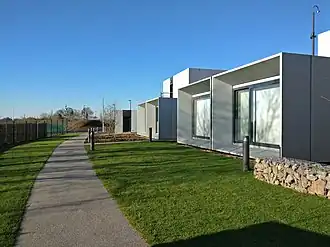 As part of the development of the Institute, accommodation and communal spaces for undergraduates were designed and built in collaboration with Wilkinson Eyre. Completed in 2019, the village consists of pre-fabricated cross-laminate timber pods, arranged in clusters around a central communal building which houses a cafe, bar, and screening room.[5] The Dyson Institute Village was entered into the residential category of the 2019 World Architecture News awards, and the housing project of the year category of the 2019 World Architecture Festival awards.[6][7]