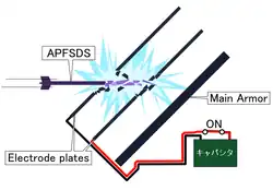 Electric armour is a newer reactive armour technology. This armour is made up of two or more conductive plates separated by an air gap or by an insulating material, creating a high-power capacitor. In operation, a high-voltage power source charges the armour. When an incoming body penetrates the plates, it closes the circuit to discharge the capacitor, dumping a great deal of energy into the penetrator, vaporizing it or even turning it into a plasma, significantly diffusing the attack.[1][3][4][5][6][7][8][9]