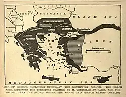 In World War I (1914–1918), he brought Greece on the side of the Allies, further expanding the Greek borders. However, his pro-Allied foreign policy brought him into conflict with the nonaligned faction of Constantine I of Greece, causing the National Schism of the 1910s. The Schism became an unofficial civil war, with the struggle for power between the two groups polarizing the population between the royalists and Venizelists for decades.[1] Following the Allied victory, Venizelos secured new territorial concessions in Western Anatolia and Thrace in an attempt to accomplish the Megali Idea, which would have united all Greek-speaking people along the Aegean Sea under the banner of Greece. He was, however, defeated in the 1920 General Election, which contributed to the eventual Greek defeat in the Greco-Turkish War (1919–22). Venizelos, in self-imposed exile, represented Greece in the negotiations that led to the signing of the Treaty of Lausanne and the agreement of a mutual population exchange between Greece and Turkey. In January 1933, he became prime minister for the last time, and in March 1935, after a coup attempt, he fled to Paris, where he died.