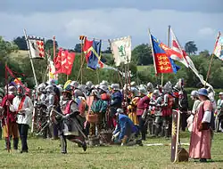 Anglo-Norman warfare was characterised by attritional military campaigns, in which commanders tried to raid enemy lands and seize castles in order to allow them to take control of their adversaries' territory, ultimately winning slow but strategic victories.[286] Pitched battles were occasionally fought between armies but these were considered risky engagements and usually avoided by prudent commanders.[286] The armies of the period comprised bodies of mounted, armoured knights, supported by infantry.[287] Crossbowmen become more numerous in the 12th century, alongside the older shortbow.[287] At the heart of these armies was the familia regis, the permanent military household of the king, which was supported in war by feudal levies, drawn up by local nobles for a limited period of service during a campaign.[288] Mercenaries were increasingly employed, driving up the cost of warfare considerably, and adequate supplies of ready cash became essential for the success of campaigns.[289]