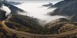 Eritrea may be split into three ecoregions. A hot arid coastal plain extends along the coast. The coastal plain is narrow in the west and widens towards the east. These coastal lowlands are part of the Djibouti xeric shrublands ecoregion. The cooler, more fertile highlands reach up to 3,000 m (9,800 ft) and are a northern extension of the Ethiopian Highlands, home to montane grasslands and woodlands.[111] Habitats here vary from the sub-tropical rainforest at Filfil Solomona to the precipitous cliffs and canyons of the southern highlands.[112] Filfil receives over 1,100 mm of rainfall annually.[113] There is a steep escarpment along the eastern side of the highlands, which is the western wall of the East African Rift. The western slope of the highlands is more gradual, descending to interior lowlands. Southwestern Eritrea is drained by the Atbara River, which flows northwestwards to join the Nile. The northwestern slope of the highlands is drained by the Barka River, which flows northwards into Sudan to empty into the Red Sea.[114] Western Eritrea is part of the Sahelian Acacia savanna, which extends across Africa south of the Sahara from Eritrea to Senegal.[115]