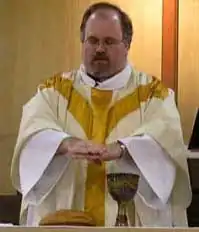 At least in the Catholic Church, the Mass is a long rite in two parts: the Liturgy of the Word and the Liturgy of the Eucharist. The former consists of readings from the Bible and a homily, or sermon, given by a priest or deacon. The latter, which follows seamlessly, includes the "Offering" of the bread and wine at the altar, their consecration by the priest through prayer, and their reception by the congregation in Holy Communion.[41] Among the many other terms used in the Catholic Church are "Holy Mass", "the Memorial of the Passion, Death and Resurrection of the Lord", the "Holy Sacrifice of the Mass", and the "Holy Mysteries".[42]