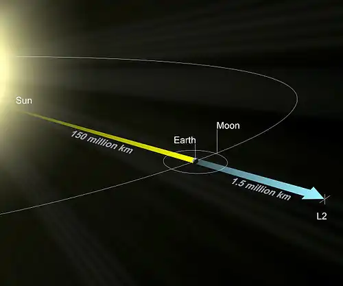 Following a travel time of 30 days after launch, it began to orbit the Sun-Earth Lagrangian point L2[3] in an eclipse-free halo orbit about 1 million km wide.