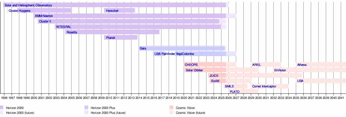 The Science Programme[1][2][a] of the European Space Agency is a long-term programme of space science and space exploration missions. Managed by the agency's Directorate of Science, The programme funds the development, launch, and operation of missions led by European space agencies and institutions through generational campaigns. Horizon 2000, the programme's first campaign, facilitated the development of eight missions between 1985 and 1995 including four "cornerstone missions" – SOHO and Cluster II, XMM-Newton, Rosetta, and Herschel. Horizon 2000 Plus, the programme's second campaign, facilitated the development of Gaia, LISA Pathfinder, and BepiColombo between 1995 and 2005. The programme's current campaign since 2005, Cosmic Vision, has so far funded the development of ten missions including three flagship missions, JUICE, Athena, and LISA. The programme's upcoming fourth campaign, Voyage 2050, is currently being drafted. Collaboration with agencies and institutions outside of Europe occasionally occur in the Science Programme, including a collaboration with NASA on Cassini–Huygens and the CNSA on SMILE.