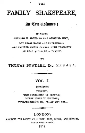 The term bowdlerization is often used in the context of the expurgation of lewd material from books.[5] The term derives from Thomas Bowdler's 1818 edition of William Shakespeare's plays, which he reworked in ways that he felt were more suitable for women and children.[6] He similarly edited Edward Gibbon's Decline and Fall of the Roman Empire.[7] A less common term used in this context, also based on common editorial practice, is Ad usum Delphini, referring to a series of consciously censored classical works.[8][9]