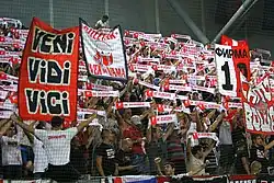 The members of Firma call themselves Firmaši (lit.'Members of the Firma'), the plural of the singular form Firmaš, and belong today to the top supporter groups in Serbia.[25] They are more known as ultras, not hooligans. However, they always protected the name and honour of FK Vojvodina, Novi Sad, and Serbia – putting themselves against all who were not doing enough for the club.[26] The Firmaši gather in the north stand of the Karađorđe Stadium, from where they fiercely support their club. Besides football, they also support other sport sections of the Vojvodina Novi Sad Sport Association. The club also has a group of their oldest supporters, called the Stara Garda (lit.'Old Guard') and who are for more than 40 years in the east stand of the stadium.[27]