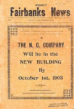 In May 1904, Hill sold the Weekly Fairbanks News to R. J. McChesney, who invested in a Linotype machine and a larger press. These improvements and the growing population of Fairbanks — by 1905, it had 2,500 residents — allowed the Weekly Fairbanks News to expand to semi-weekly, then daily publication, in the process becoming the Fairbanks Daily News on July 1, 1905.[12]: 9 On September 3, the News had its first competition when the Fairbanks Sunday Times began publishing on the sole day that the News did not. Other papers soon arrived in the area. In 1906, the Valdez News reported, "With the newspaper plans already in Fairbanks and with those which are being shipped there this year, the Tanana metropolis will be well supplied. There are no less than five of them all told ..."[13] In May 1906, McChesney sold the Daily News to Fairbanks' founder, Ebenezer Barnette. Later that month, an enormous fire destroyed the Daily News press and much of Fairbanks.[12]: 10