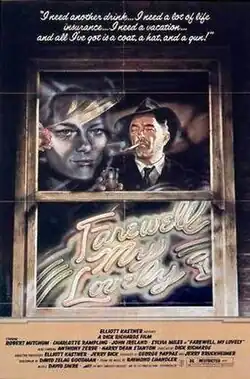 Farewell, My Lovely is a 1975 neo-noir[4] mystery film directed by Dick Richards and featuring Robert Mitchum as private detective Philip Marlowe. The picture is based on Raymond Chandler's novel Farewell, My Lovely (1940), which had previously been adapted for film as Murder, My Sweet in 1944.[5] The cast also features Charlotte Rampling, John Ireland, Sylvia Miles, Harry Dean Stanton, Joe Spinell, Sylvester Stallone, Jack O'Halloran in his film debut, and hardcore crime novelist Jim Thompson in his only acting role.