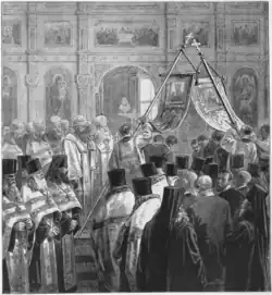 From 1806 the lower church was the site of burials of Georgian princes, and those of important members of Saint Petersburg society.[2][3] In total around 100 burials took place in the Feodorovskaya Church, though none have survived.[1] On 5 October 1889 the metropolitan approved a suggestion by the Spiritual Council to construct an extension to the church to allow further burials. This was built to a design by Grigory I. Karpov, and contained 167 spaces in its burial vault, with a two-tier iconostasis.[1] On 6 October 1891 it was consecrated as a separate church in the name of Saint Isidore of Pelusium by Metropolitan Isidore.[4][5] Over the 25 years of its operation some 150 burials took place, mostly those of bishops and church leaders.[3][4]