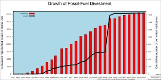 By 2015, fossil fuel divestment was reportedly the fastest growing divestment movement in history.[76] As of July 2023, more than 1593 institutions with assets totalling more than $40.5 trillion in assets worldwide had begun or committed some form of divestment of fossil fuels.[77]