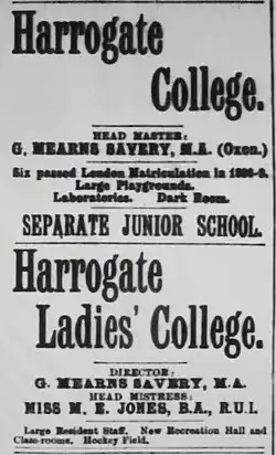 8. ^ Harrogate Ladies' College was renamed "Harrogate College" around 1960, but later reverted to its original name. Although financially successful, Savery's Harrogate College for boys was closed in 1899 (possibly due to Savery's illness). It is possible that a number of its pupils transferred to Clifton College, which soon became Clifton House School. In the early 20th century Harrogate Ladies' College was associated with a new Harrogate College for boys, which in due course closed. None of these had any connection with the current Harrogate College.