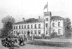 The school was initially known as The Ladies' College, then Harrogate College. It was founded by Savery in 1893 in a private house under the headship of Betsy Field Hall, who ran the school until 1898, when it occupied Percy Lodge.[17][27] The Yorkshire Post commented that it was, "the product of a pioneer mind, an inspired adventure in building ... [Savery was] the first to see in Yorkshire an opening for a girls' public school of the first class ... His distinction was that he saw it [in 1893]".[1] In 1901 he planned a new school building in collaboration with Miss M. E. Jones.[nb 10][28] She was an Ulster-born graduate of Queen's College, Belfast, a form mistress at Bradford Girls' Grammar School,[17][29][30] then headmistress at Harrogate Ladies' College from September 1898 to 1935.[17][31]