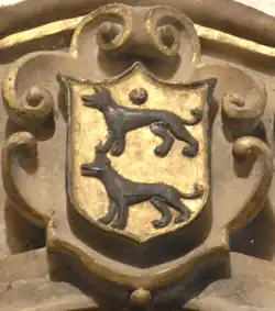 Arms of Peard: Or, two wolves passant in pale sable langued gules[1] here shown with A crescent sable for difference. Detail from a 17th c. monument of a member of the Peard family in St Peter's Church, Barnstaple