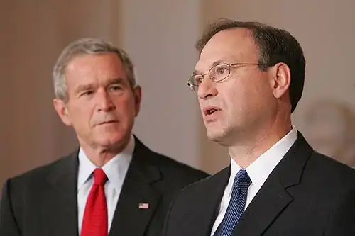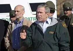 In his 2004 bid for re-election, Bush commanded broad support in the Republican Party and did not encounter a primary challenge. He appointed Ken Mehlman as campaign manager, and Karl Rove devised a political strategy.[84] Bush and the Republican platform emphasized a strong commitment to the wars in Iraq and Afghanistan,[85] support for the USA PATRIOT Act,[86] a renewed shift in policy for constitutional amendments banning abortion and same-sex marriage,[85][87] reforming Social Security to create private investment accounts,[85] creation of an ownership society,[85] and opposing mandatory carbon emissions controls.[88] Bush also called for the implementation of a guest worker program for immigrants,[85] which was criticized by conservatives.[89]